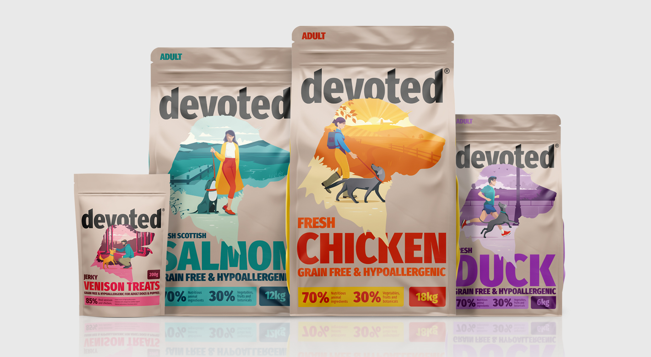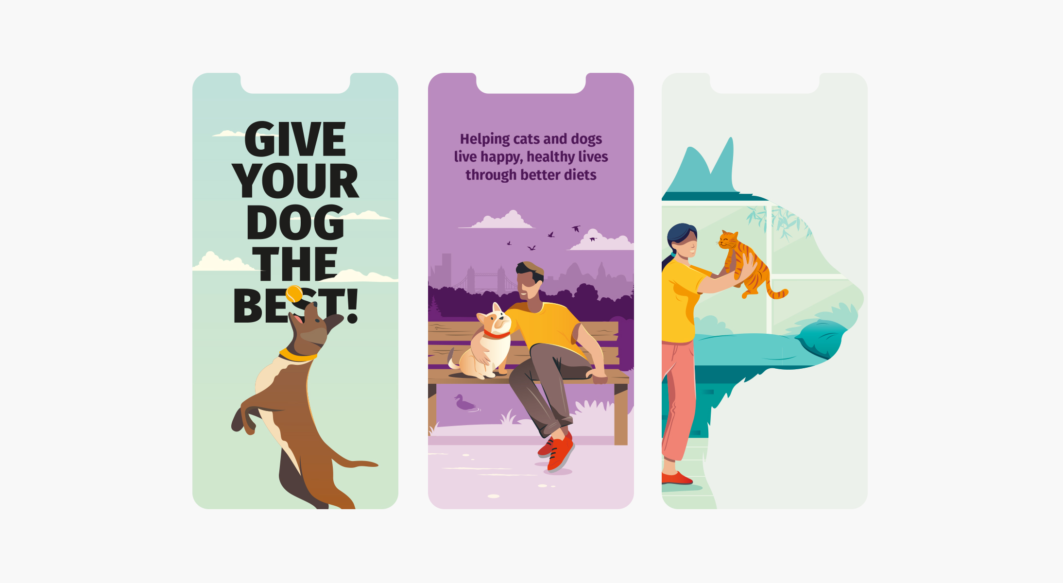 We took a completely different approach to the new branding and packaging often found in the pet food sector. We homed in on the importance of having a household pet and expressing the unconditional bond through bespoke illustrations, depicting scenarios that take place daily, whether it’s walks through the forest, running in the city, playing fetch or gentle strolls by the coast. The packaging was designed to connect with the owner on a personal level, the limited colour palette depicting the flavour sku and jumping off the shelf ahead of the rest.